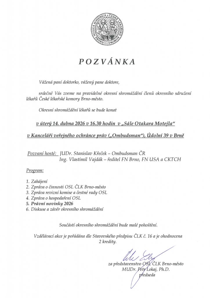 Okresní shromáždění lékařů OSL ČLK Brno-město 2026 - pozvánka - 14.4.2026